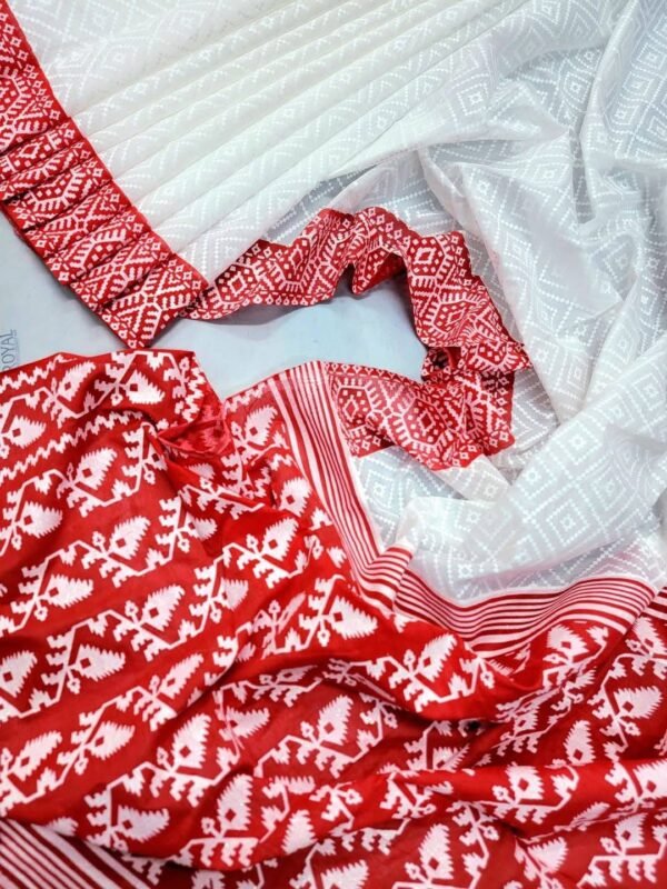 পূজা এক্সক্লুসিভ চান্দেরি সিল্ক+স্ক্রিন প্রিন্ট শাড়ি (সাদা লাল-২)