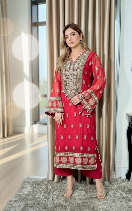 কড়ি + সিকুয়েন্স + এম্ব্রয়ডারি পাকিস্তানি ইন্সপায়ার্ড রেডিমেড জর্জেট টু-পিস!!(কোর্ডস:৩১) লাল কড়ি